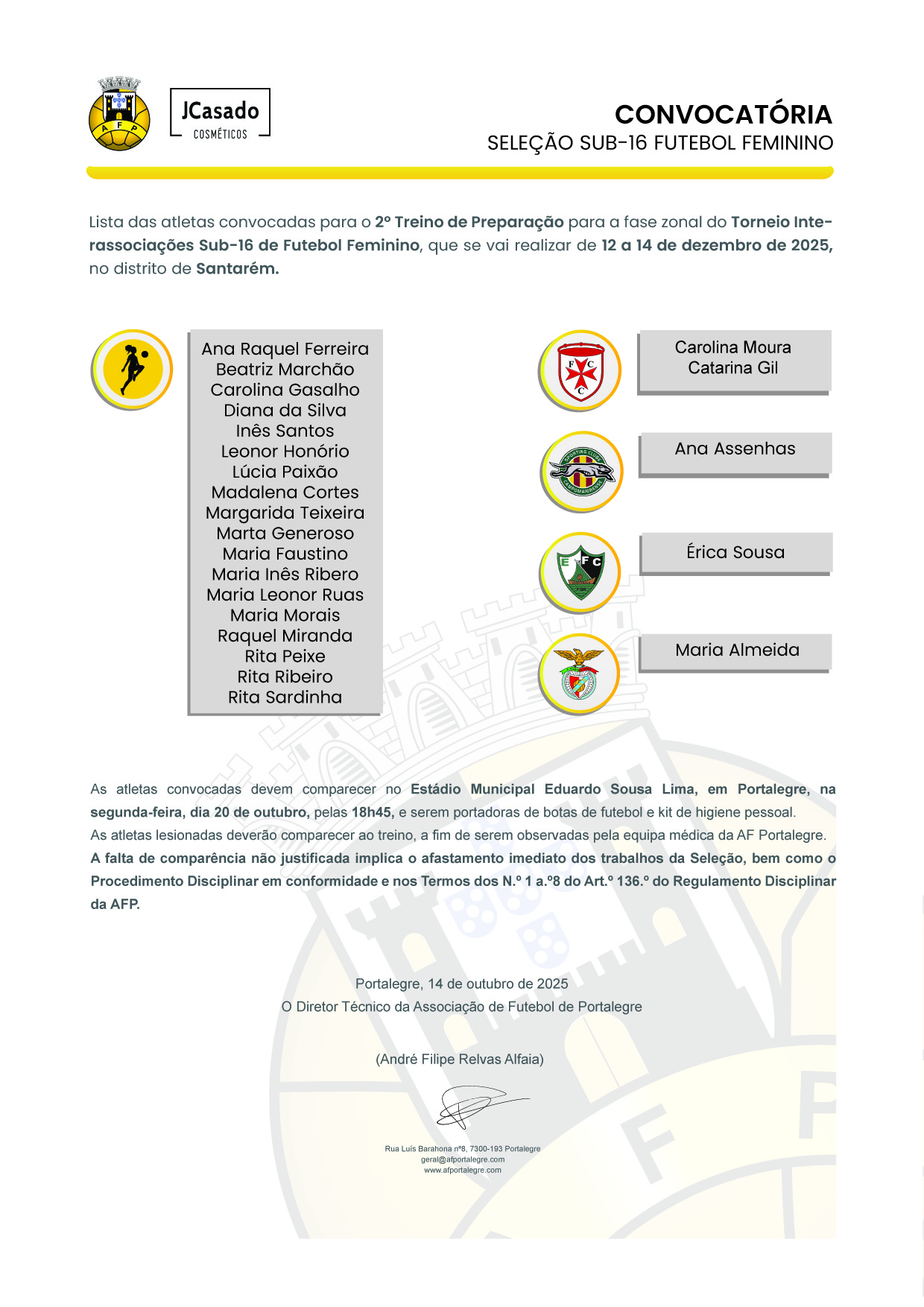 As atletas devem comparecer no Estádio Municipal Eduardo Sousa Lima, em Portalegre, na segunda-feira, dia 20 de outubro, pelas 18h45.