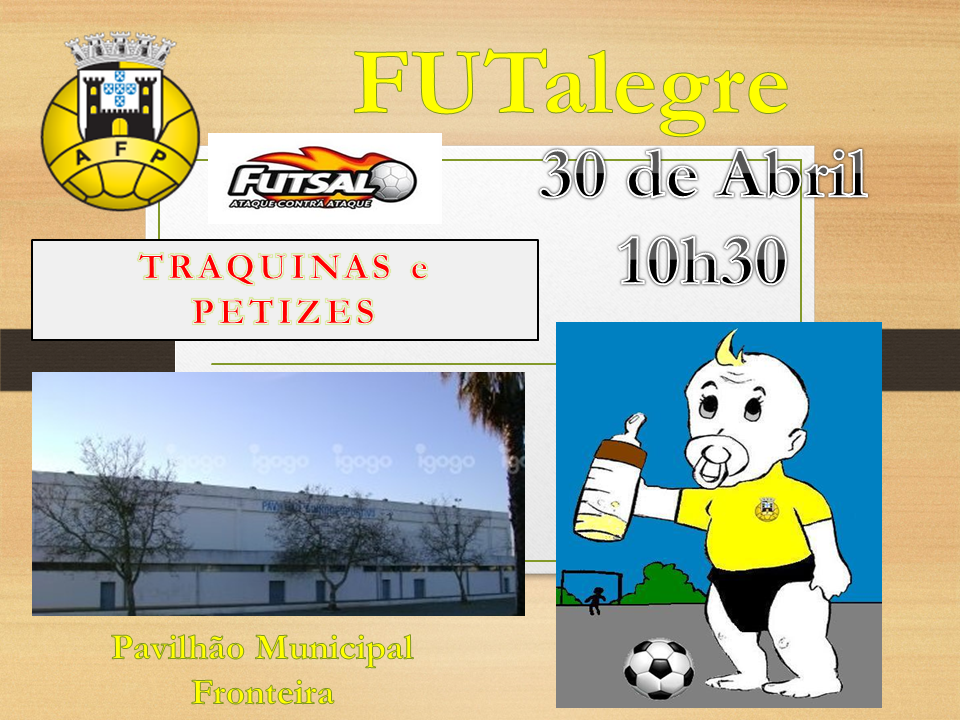 Data: Domingo, 30 de Abril de 2017 Hora: 10:30 Local: Pavilhão Municipal Modalidade: Futsal Escalões: Traquinas (Anos: 2008 e 2009) e Petizes (Anos: 2010 e 2011)